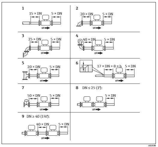 h 管道擴徑時產生的高度差 1 一級縮徑管 2 單向彎頭(90°彎頭) 3 雙向彎頭(2 × 90°彎頭,相對) 4 3D雙向彎頭(2 × 90°彎頭,相對,不在同一平面上) 5 三通 6 擴徑管 7 控制閥 8 兩臺測量設備并排安裝,DN ≤ 25 (1"):直接法蘭對法蘭安裝 9 兩臺測量設備并排安裝,DN ≥ 40 (1½"):安裝間隙參考圖示說明